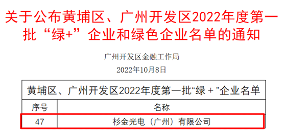 近日,根據《關于印發廣州市黃埔區 廣州開發區綠色項目、綠色企業認定管理辦法(試行)的通知》(穗開金融規字〔2020〕4號)文件要求,經企業申報,第三方認證機構評審、認定,廣州開發區金融工作局受理、審查、公示等程序,杉金廣州成功入選黃埔區、廣州開發區2022年度第一批“綠+”企業。