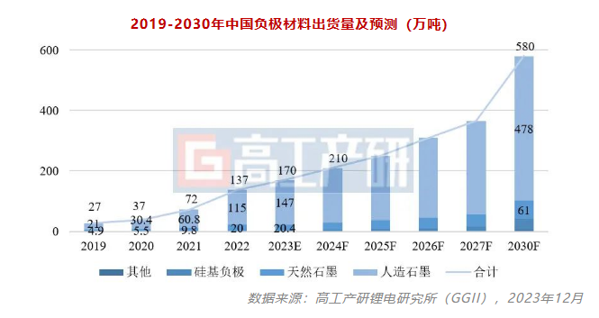 首先,從市場空間來看,面向TWh時代,負極材料市場仍具持續增長潛力。GGII預計,2030年我國負極材料出貨量有望達到580萬噸,其中人造石墨仍為市場主流,出貨量超470萬噸。